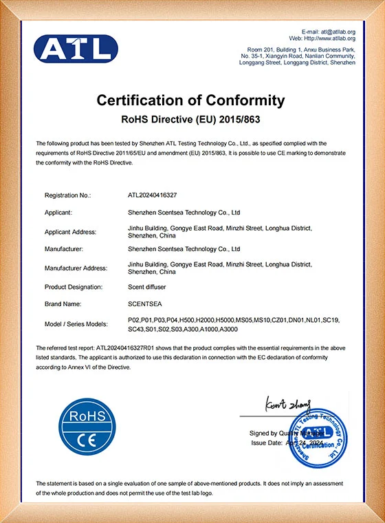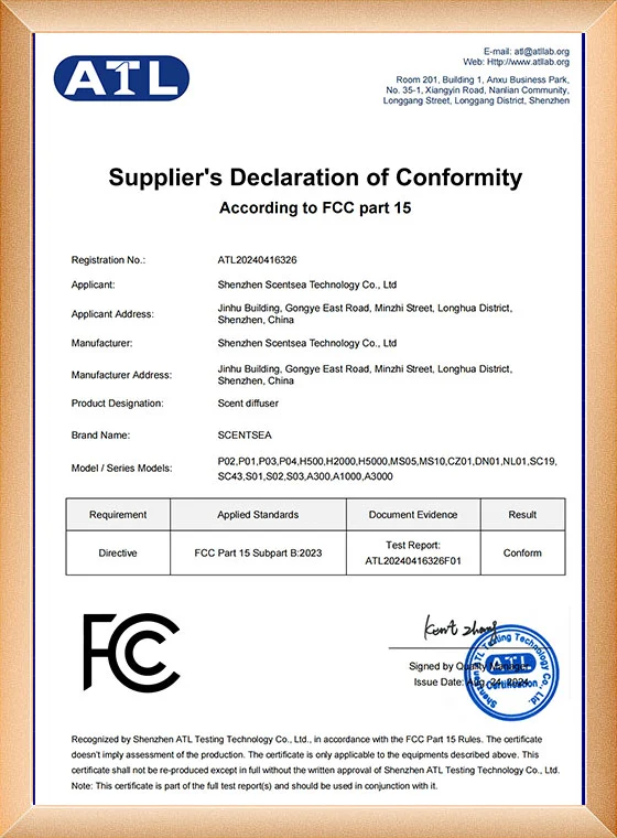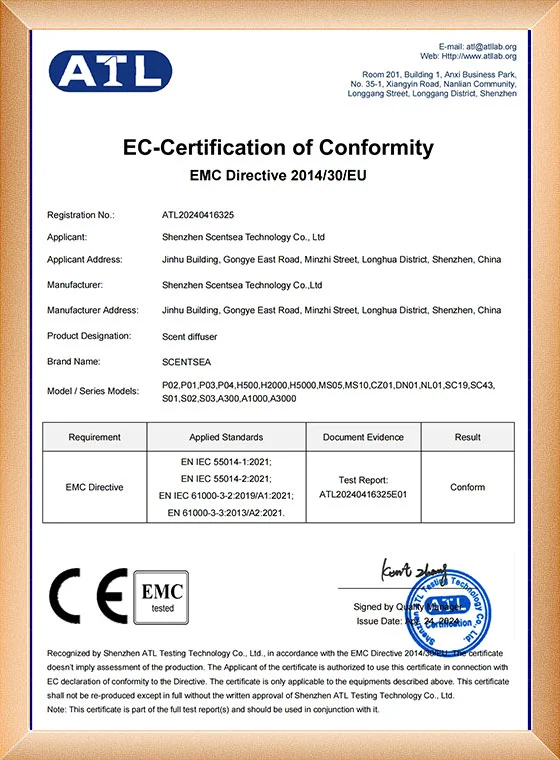 Tất cả các máy khuếch tán hương thơm của SCENTSEA đều có chứng nhận CE, ROHS, FCC và SGS. Cho đến nay, máy tạo mùi hương của SCENTSEA đã được lắp đặt tại hơn 70 quốc gia và được khách hàng đánh giá cao.
